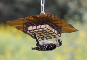 Upside-down feeder: The upside-down feeder allows birds to feed from below, which is ideal for woodpeckers, nuthatches, chickadees, and other clinging species but challenging for blackbirds. It is also simple to refill, clean, and hang.