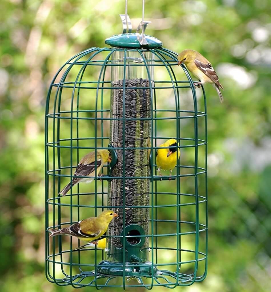 Songbirds will be shielded from predators by a unique cage placed around their feeders. When a hawk is nearby, birds are aware of it and are prepared to flee if it suddenly swoops down on them while feeding.