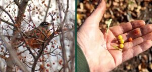 There are some plants that can provide food for robins during the winter you can consider growing in your gardens such as American Crabable, smooth sumac, winterberry, Cranberrybush Viburnum, and American bittersweet.